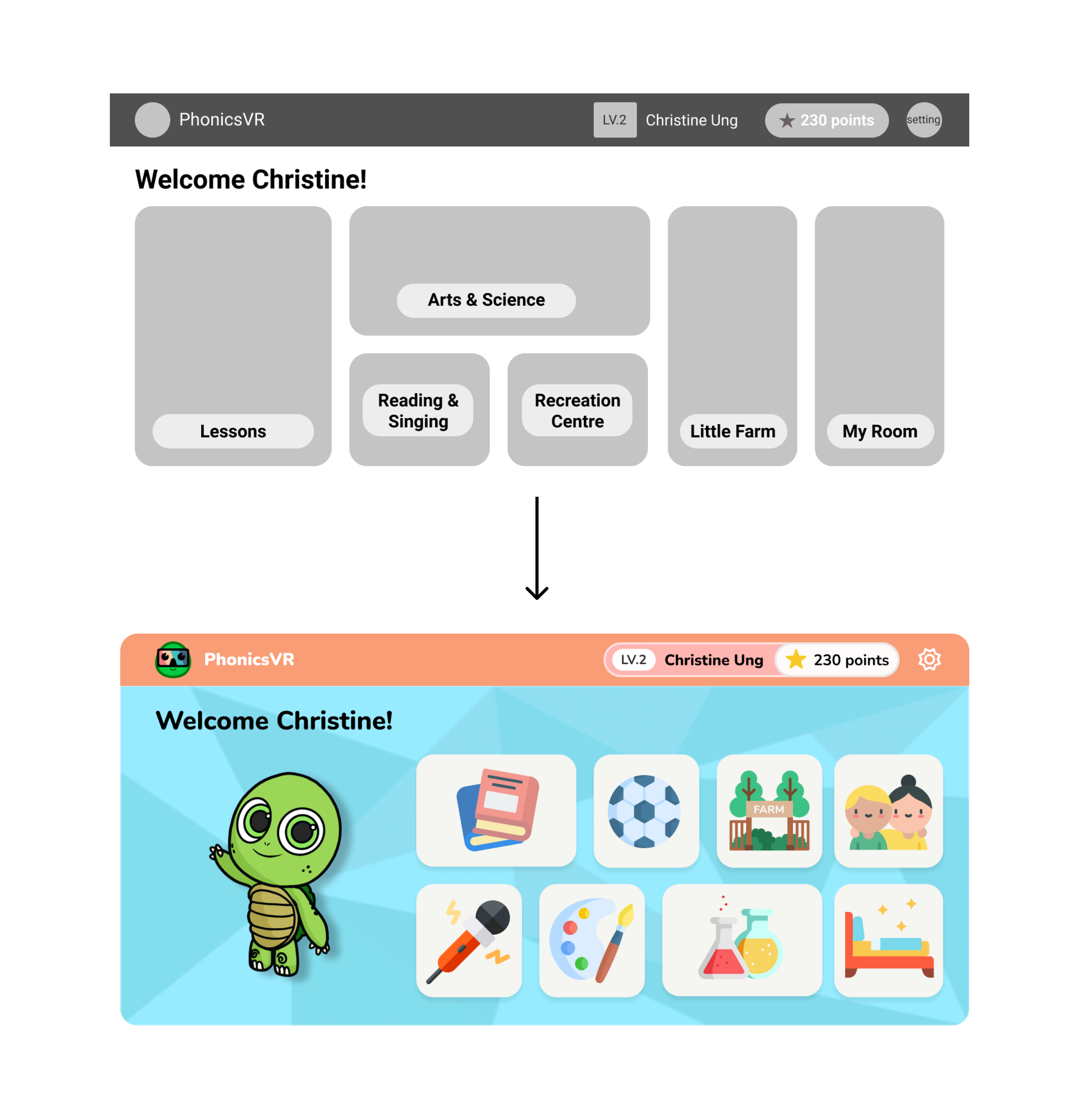I redesigned the interface so that it has a clear hierarchy and a simple user flow for the young users.